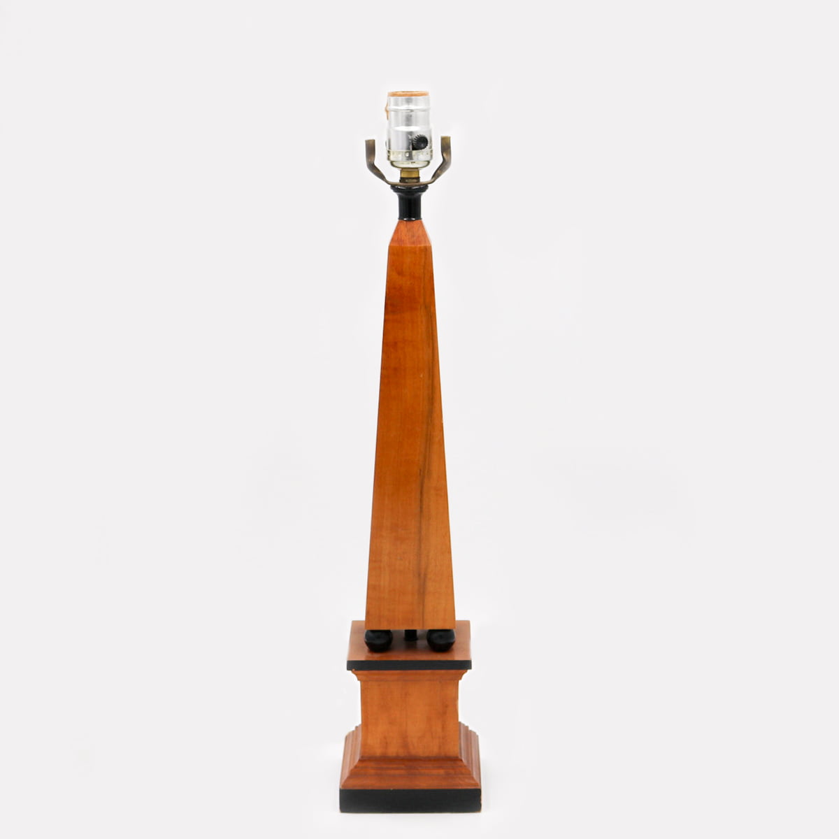 This colonial style vintage light fixture has a beautiful soft walnut look. The lamp has a strong obelisk shape with an accent of black framing at the bottom of the pillar. Mid post there is a square of spheres supporting the top of the obelisk in the same black accent as the lower pillar. No lamp shade included.